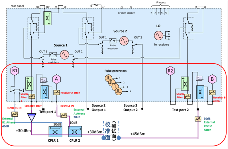 4. 要选择对应频段的驱动放大器、耦合器、隔离器、衰减器等,要注意加入驱动放大器后,Port1需要很小的源功率输出,尤其是在校准过程中,防止烧坏功率探头或校准件。