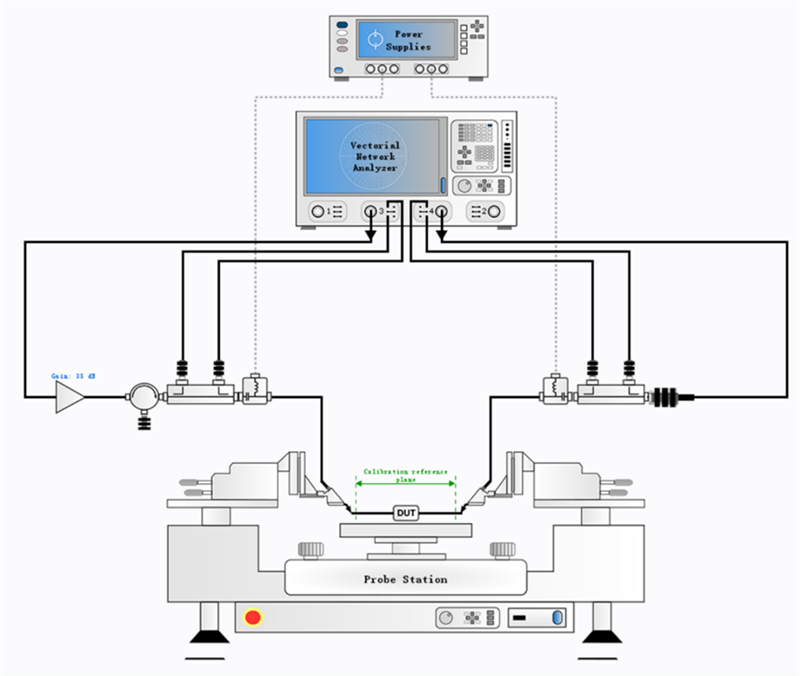 在片MMIC测试通常用到的仪器设备如下:晶圆探针台、矢量网络分析仪、电源(支持脉冲)、前置驱动放大器、双定向耦合器等等。
